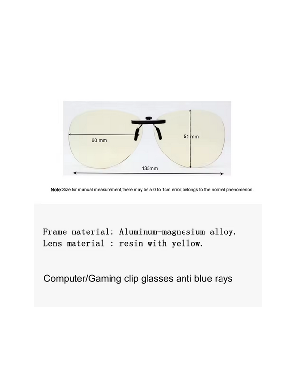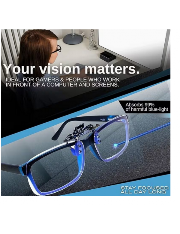 Clip Lunettes avec filtres des lumières bleues qui bloquent la mélatonine et fatiguent la rétine . Effets reposants et protecteurs de votre vision .